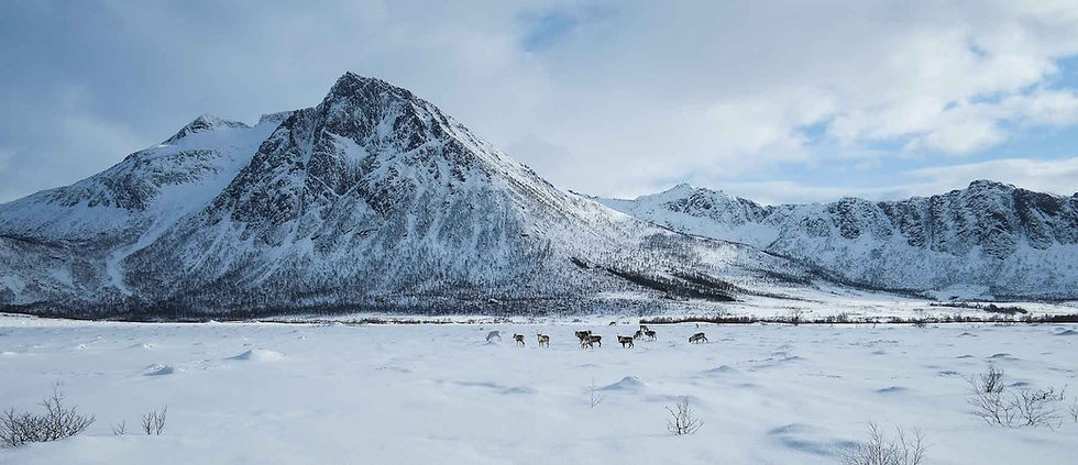 C'est à 2 000 km d'Oslo, aux portes de l'arctique, que nous allons rencontrer les rennes, "domestiques" dans ce secteur de la Norvège. De la famille des cervidés et herbivores, nous les apercevons sur des crêtes, dans les vallées, au sortir d'un virage, grattant la neige avec leurs pattes pour atteindre la nourriture... En Norvège le renne n'est pas très grand, la hauteur au garrot est généralement comprise entre 107 et 127 cm. Le mâle et la femelle ont une armure. Il neige, il fait soleil.. les giboulées s'enchaînent ...mais le panorama est grandiose !